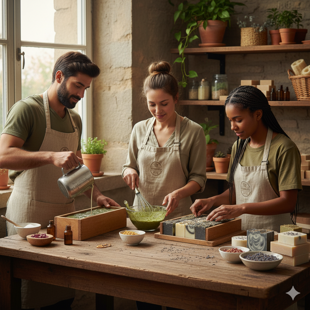 On se connaît par cœur, on se complète, on se marre souvent… et surtout, on partage la même envie : fabriquer de bons savons, respectueux de la peau et de la planète.